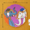 Two Elephants?. It is a hand-painted picture on a wooden plate, and it depicts two elephants standing next to each other. The elephants are painted in intricate detail, and they are adorned with colorful jewelry. The background of the painting is purple, and there is a border of flowers and vines around the edge.
